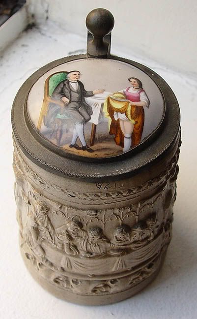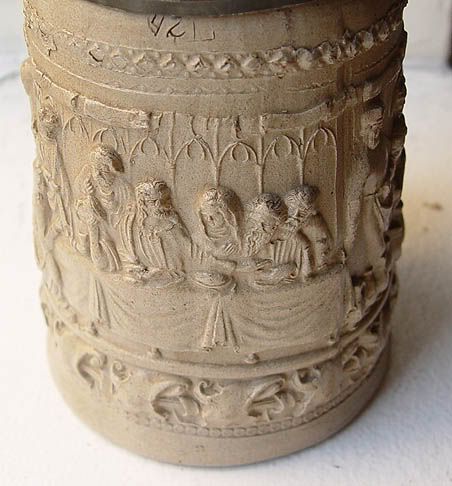 this is a stoneware stein with an interesting combination of images...the body features a last supper scene, while the pewter lid is set with a risque porcelain plaque (the German caption roughly translates to "The cook herself will become the meal"). no marks or signatures, except for "1/2L" capacity designation scratched into the side of the stein before firing. i am guessing this is maybe saxony circa 1830. but i don't know much about steins, so can anybody confirm or deny this? thanks! paul http://i199.photobucket.com/albums/aa245/misterbug2/stein1.jpg http://i199.photobucket.com/albums/aa245/misterbug2/stein2.jpg http://i199.photobucket.com/albums/aa245/misterbug2/stein3.jpg