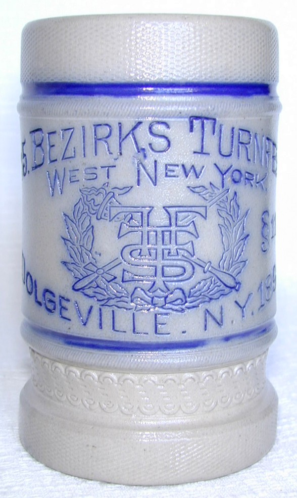 | While technically speaking it is not a stein (no lid), Whites of Utica manufactured a mug for an American Turnfest which was held in Dolgeville, NY, in 1894. The saltglazed mug displays another version of the FFST logo, with crossing sword and torch, and the obligatory laurel wreath. The incised cobalt design indicates it was made for "25. Bezirk's Turnfest", "West New York", "Dolgeville, N.Y. 1894". Found on the base below the handle, the manufacturer's trademark - C.N.Y., Utica, NY - is that of White's Pottery. | ![]() |