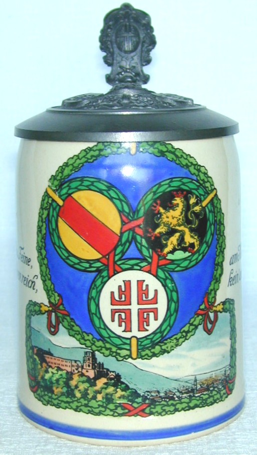 | This half-liter creamware stein links the 4F movement to state and city pride. The Heidelberg Castle appears below the central wreath, and the familiar ode to Heidelberg appears on the sides: Alt Heidelberg du Feine, du Stadt an Ehren reich, am Neckar und am Rheine, kein' and're kommt dir gleich (Old Heidelberg, you are so fine, You city rich in honor, On the Neckar and the Rhine, like you there is no other). The circular design above the castle displays the colors of the State of Baden, a rampant lion, and the 4F symbol. The smaller rings are wreathed in laurel, while the entire scene is surrounded by a garland of oak. The relief pewter lid and thumblift display the 4F symbol, Turnvater Jahn, the words "Gut Heil", and the oak branches. | ![]() |