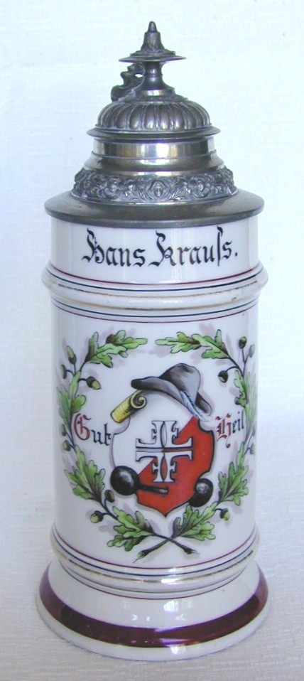 Left, a half-liter porcelain stein, named to Hans Kraus