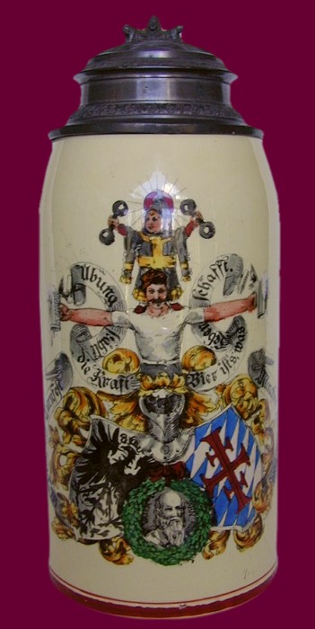 Returning to the questions posed at the beginning of this article, a 4F stein is simply one which features the 4F insignia (or one of the recognized variants) as a central part of the theme. Thus the character stein of a weight bearing the 4F insignia is a 4F stein, while the one of Turnvater Jahn is relegated to the category of "go-with". Friedrich Ludwig Jahn began the organized gymnastics movement in Germany and appealed to a sense of pride, personal well-being and patriotism. Local and national competitions were held, providing competitors, attendees and latter-day stein collectors with a variety of 4F steins. As a routine part of everyday life, German immigrants brought their interest in exercise and fitness to the U.S., and it ultimately became the stimulus for physical education in our school system.