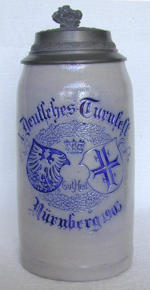![]() ![]() At left, a half-liter relief creamware stein by Reinhold Merkelbach, unnamed, showing gymnastics (parallel bars, high bar, pommel or vaulting horse), Vater Jahn, the words Frisch, From, Froh and Frei, and a reference to "Turners". (The term "Turner" is asserted to be a derivative of the French word "Tournier", or tournament, or as simple reference to the "turning" done in gymnastics.) |