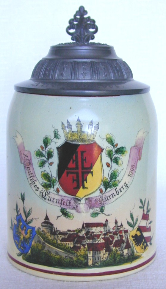 with oak and laurel embellishments.To the right, this half-liter saltglaze stein was designed by famous artist Franz Ringer as the Offizieller Festkrug ("Official Fest Stein") for the XI. Deutsches Turnfest in Frankfurt, 1908. The magnificent spread-winged eagle on this piece virtually screams strength, determination, patriotism. Note also the oak wreath and the acorn thumblift. The relief pewter lid shows the skyline of Frankfurt. Ringer was a renowned artist in his own time, yet he designed souvenir steins! |