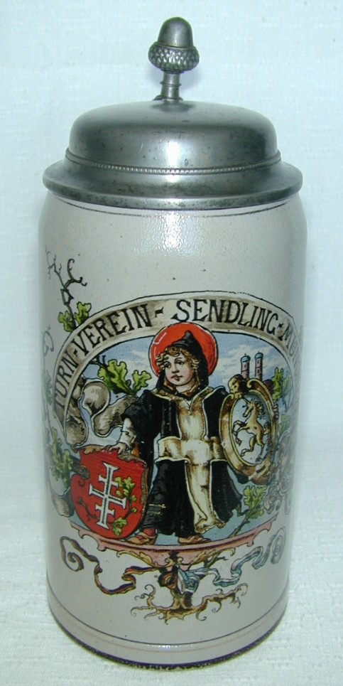 At left is a one-liter creamware souvenir stein memorializing the VII. Deutsches Turnfest held in Munich in 1889. Talk about full of symbols! The stein shows a shield with the Prussian Eagle, the 4F symbol on a shield displaying the blue and white colors of Bavaria, an image of Turnvater Jahn surrounded by an oak wreath, a competitor holding two over-flowing steins at arm's length, and the Münchner Kindl, ubiquitous symbol of Munich, standing on the competitor's shoulders and hoisting two barbells! The pewter lid is a nice relief of the city skyline, and the thumblift is a Munich Child with outstretched arms. The one-liter saltglaze stein at right above was made in 1893 for Sendling (Munich), and it again bears a prominent image of the Münchner Kindl. The acorn thumblift, a new symbol, stands for good luck. |