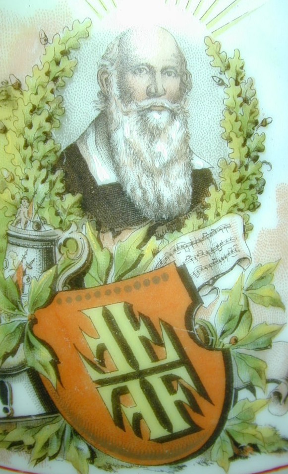 skills, and it is quite common to see steins bearing their owners name.Right, etched Mettlach, form 1914 (made in 1898), unnamed, shows the 4F logo on the body and inlay, a proud competitor wearing the sash of his Turnverein, holding a flag and a barbell, standing in front of parallel bars and a high bar. Mettlach 1914 also has a nice figural thumblift of Turnvater Jahn, who originated the 4F movement as a means of preparing the populace for resistance to Napoleon. Finally, a close-up of the central design of Mettlach 1914, probably the most widely held Mettlach 4F stein. |